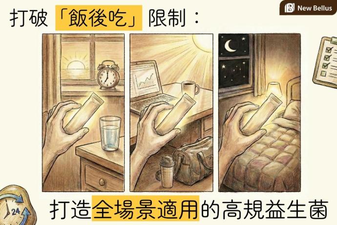 Newbellus 致力於透過高階原料技術,協助品牌商打破這道門檻。 藉由專利五層凍晶微包埋結構,您的產品能主打「全時段適用」的高階訴求——無論是早起空腹的第一包補充,或是忙碌間隙的隨手一包,皆能確保菌株安全通過體內環境考驗。
