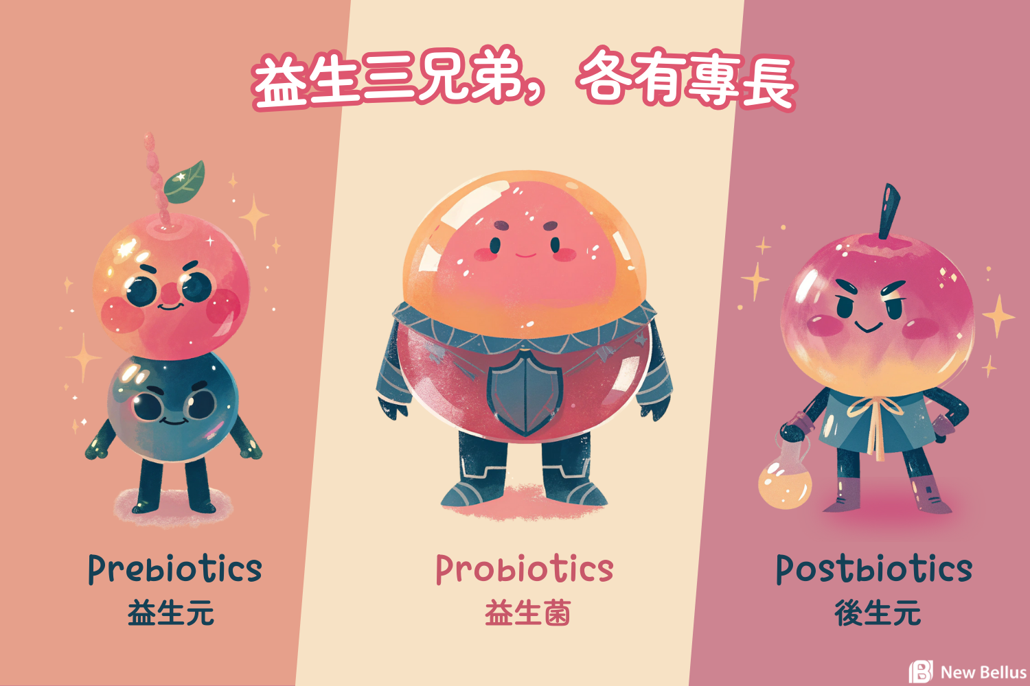 - 三弟:後生元(Postbiotics) → 靈活的技能包,不靠活菌也能立即發揮作用。