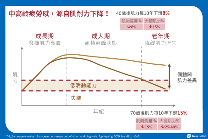 這代表未來近一半人口將屬於高齡族群,對健康照護與日常行動維持的需求將大幅提升。隨著年齡增長,許多人會感覺「比年輕時更容易疲勞」,其實關鍵在於肌耐力隨年齡下降。研究顯示,從40 歲起肌肉質量就會逐漸流失,每10年約減少8%,70歲後甚至加速到15%。這不僅影響行動力,也讓生活節奏變得更容易感到吃力。